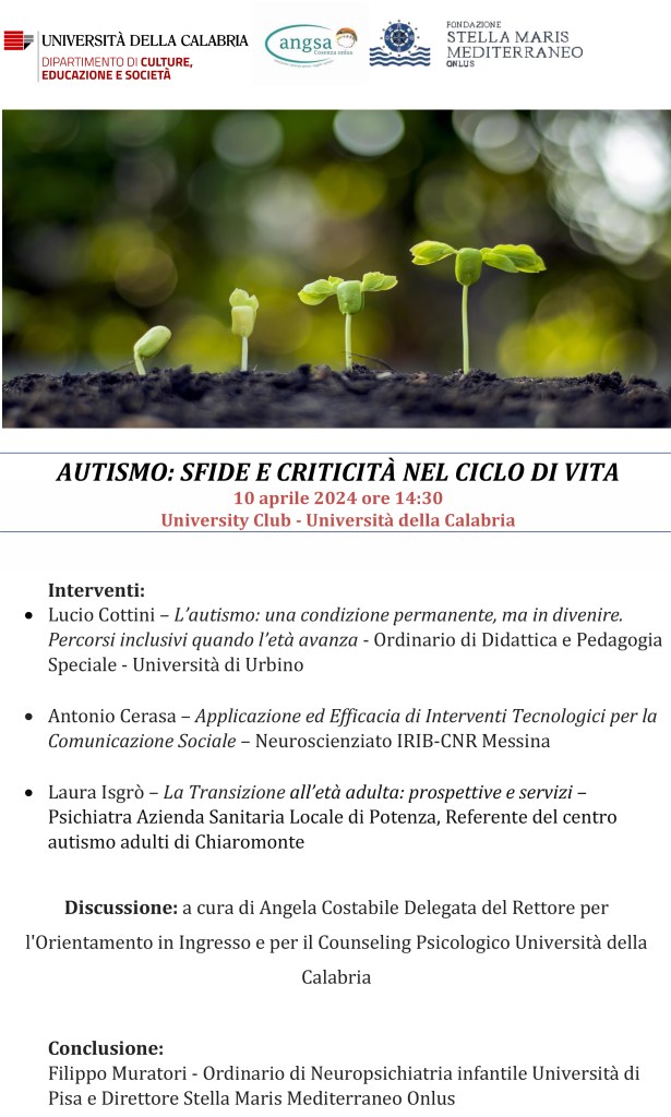 Nell’ambito del seminario organizzato dalla Prof. Costabile dell’UNICAL dal titolo “AUTISMO: SFIDE E CRITICITÀ NEL CICLO DI VITA”, il 10 aprile parleremo delle nuove frontiere sul trattamento dei sintomi dello spettro.